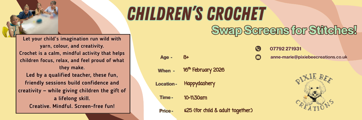 Over four weekly sessions, we’ll build skills step by step, starting with hand positions, slip knots and chaining, before moving on to double crochet, half treble, treble and double treble crochet. By the end of the course, you’ll have the confidence and knowledge to tackle most crochet projects on your own, or continue learning with me in future classes.